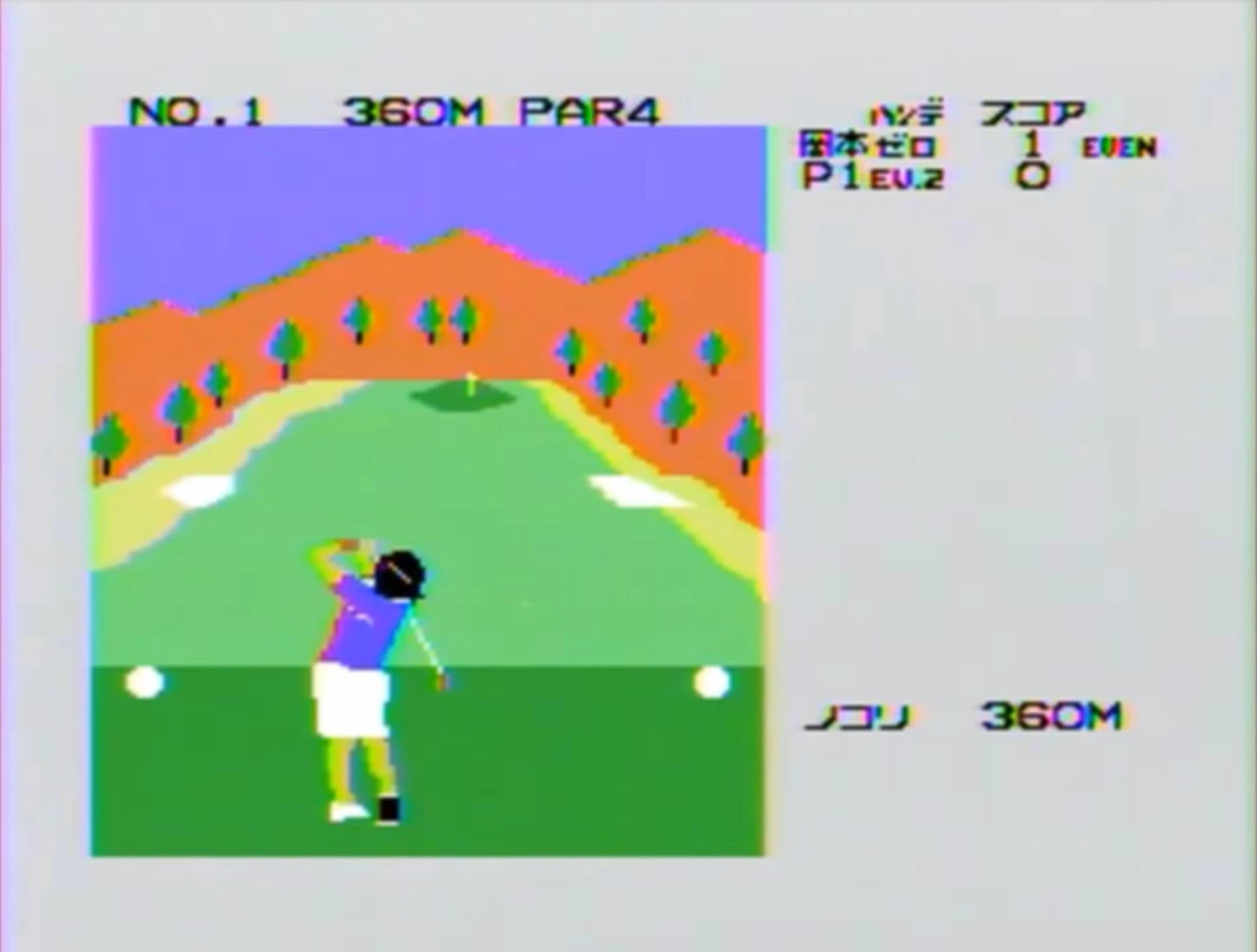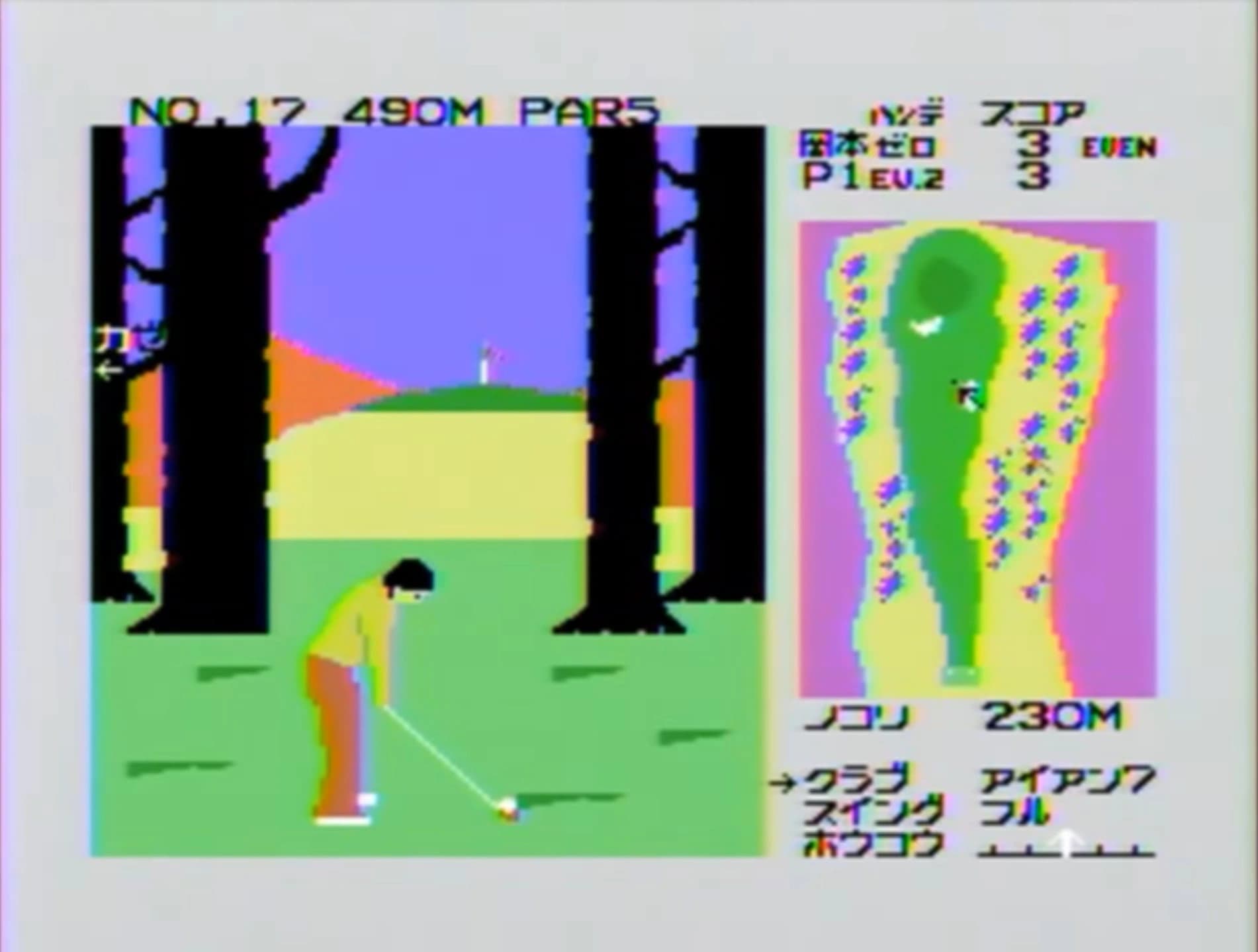This is a two-player golfing game licensed from Ayako Okamoto, a well-known female Japanese golfer. Players can choose to play as either a female or male golfer. The main gameplay features a third-person view from behind the golfer, while a sidebar displays a top-down map of the tee. Standard statistics, such as par and distance to the hole, are also included.