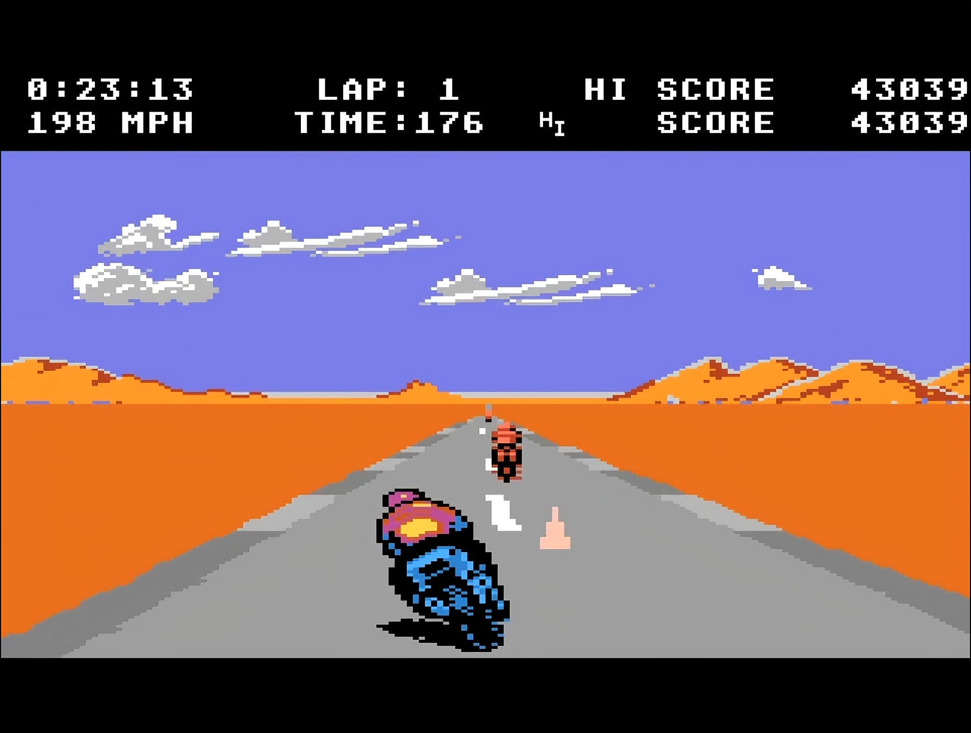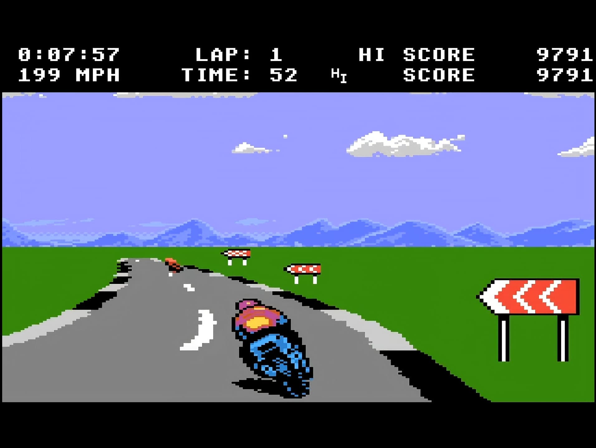 Motor Psycho is a high-speed, action-packed motorcycle racing game. The objective is to race through one of four tracks, aiming to complete each course as quickly as possible while accumulating the highest score. Players must navigate tight turns, dodge obstacles, and maintain control of their motorcycle to avoid crashes and maximize their point total. The game challenges players'' reflexes and precision, with fast-paced racing action that demands both skill and strategy to secure the best times and points. Each track offers unique challenges, pushing players to improve their racing techniques with each run.