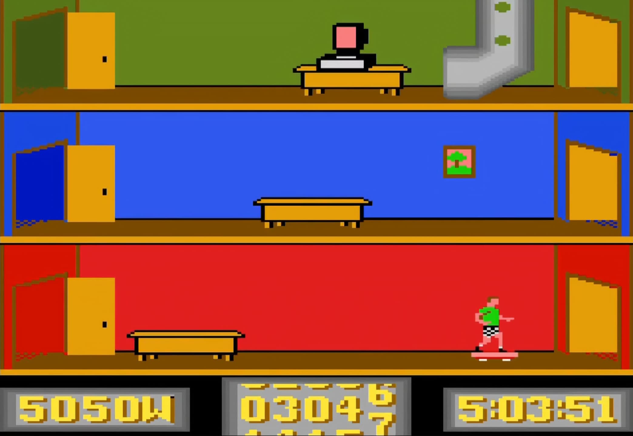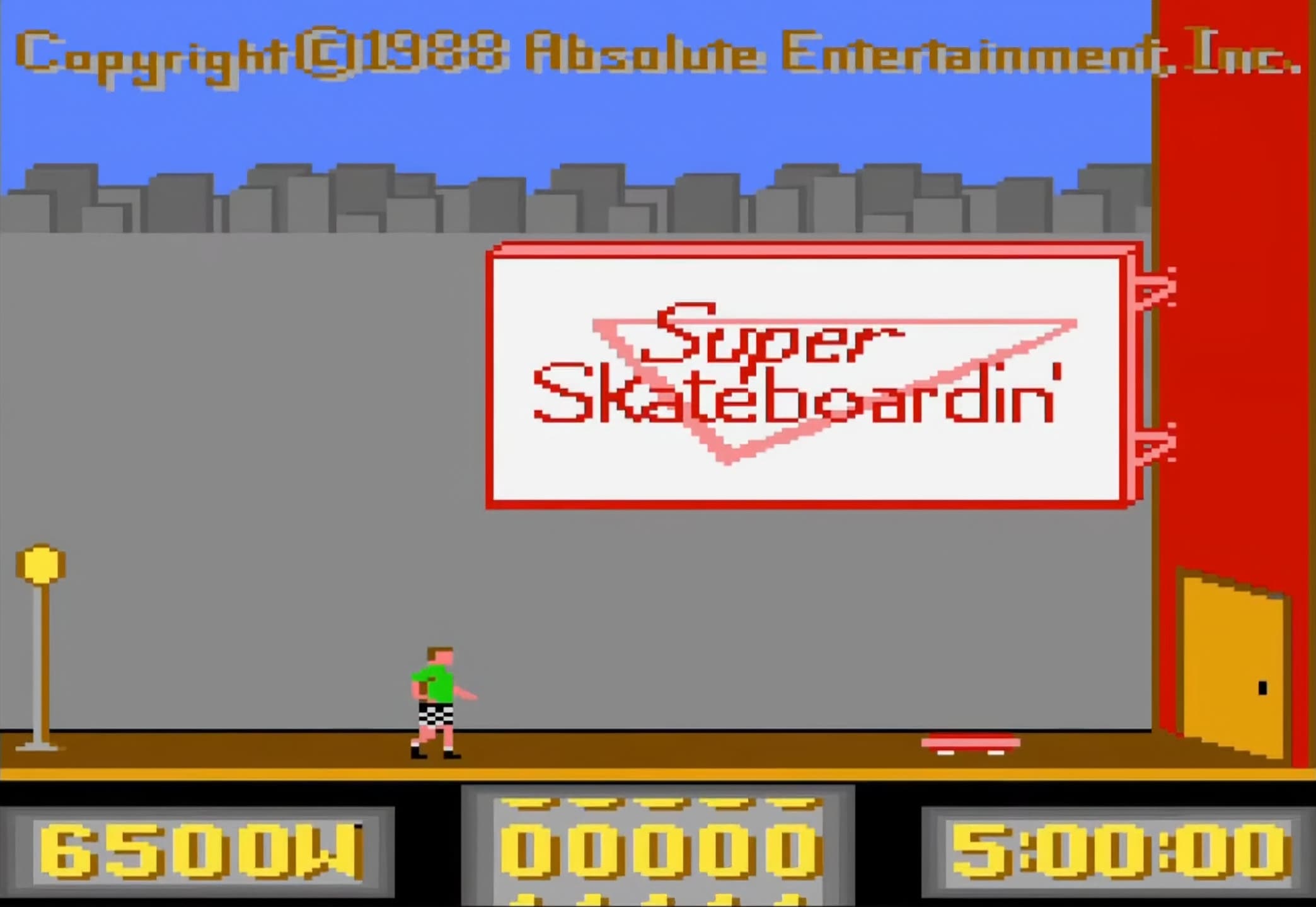 Super Skateboardin'' is a time-limited skateboarding game where players must find and complete thirty hidden tricks across various levels within five minutes. The player can jump over obstacles and skitch (grab onto moving vehicles) to save time. The crouch ability, activated by holding the fire button, is essential for passing through pipes. The objective is to complete all the tricks and score as high as possible before time expires.