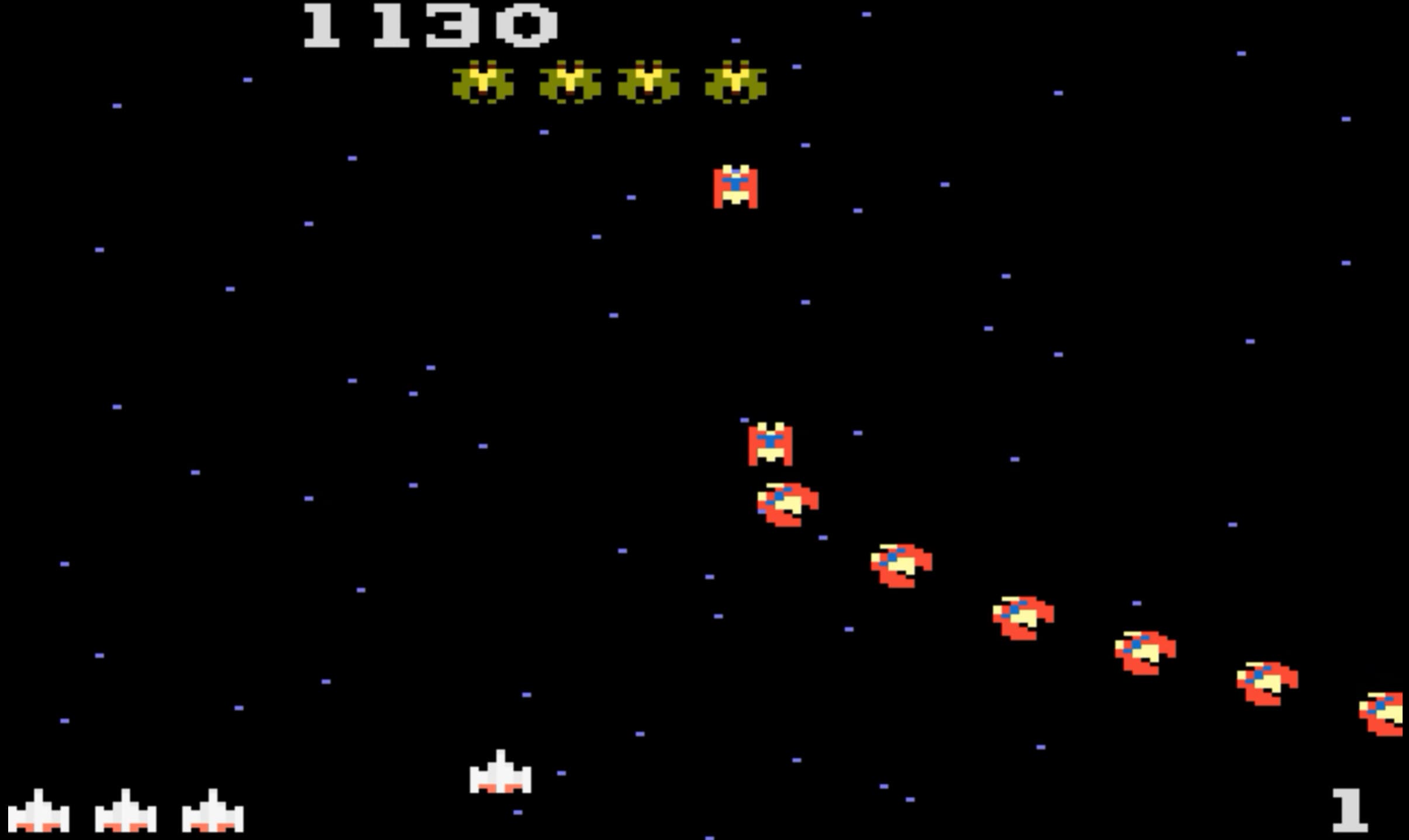 Galaga is a classic fixed shooter arcade game where the player controls a lone starfighter at the bottom of the screen, tasked with defending Earth from waves of alien invaders. The objective is to defeat all the Galaga aliens in each stage, who approach from the top and sides of the screen, flying into formation. As with its predecessor Galaxian, the aliens dive towards the player and shoot projectiles, and the player must avoid these attacks while retaliating by shooting down the enemies. A collision with an enemy or its projectiles results in the loss of a life.
