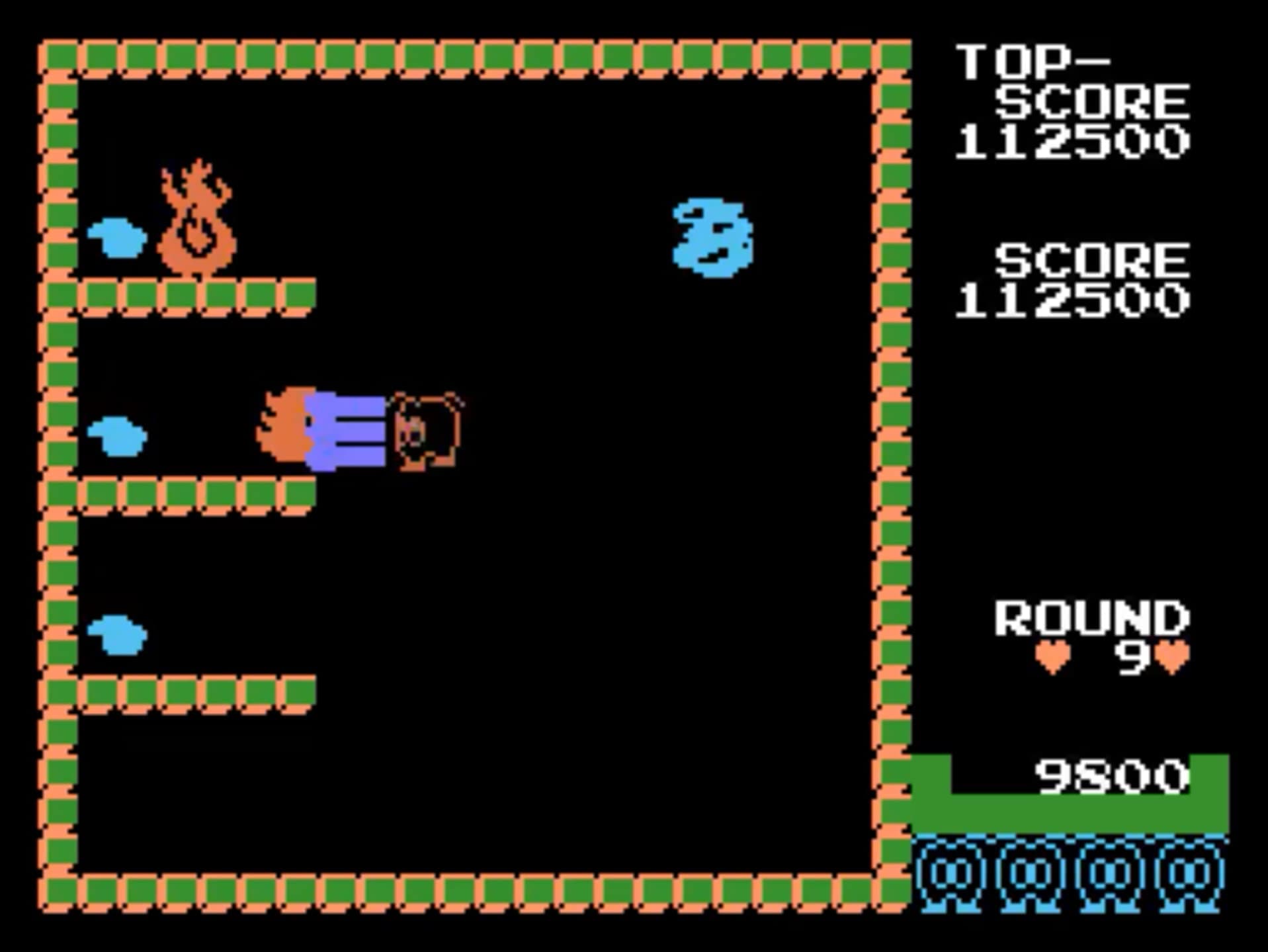 The main character can unleash three blasts of liquid before running dry. With each blast, the character moves faster but also gets closer to becoming an empty outline with pink shoes. When completely empty, the character becomes a shell of a sprite, gaining even more speed. Liquid is replenished by drinking from puddles, and occasionally, an alcoholic beverage appears in the center of the screen. Picking it up refills the characterâs liquid supply, temporarily freezes the fires, and changes the characterâs color to red.