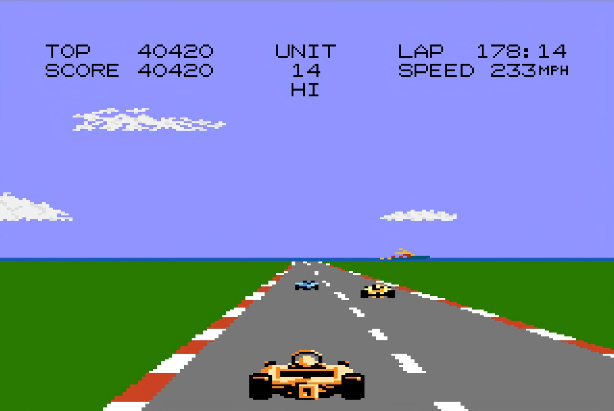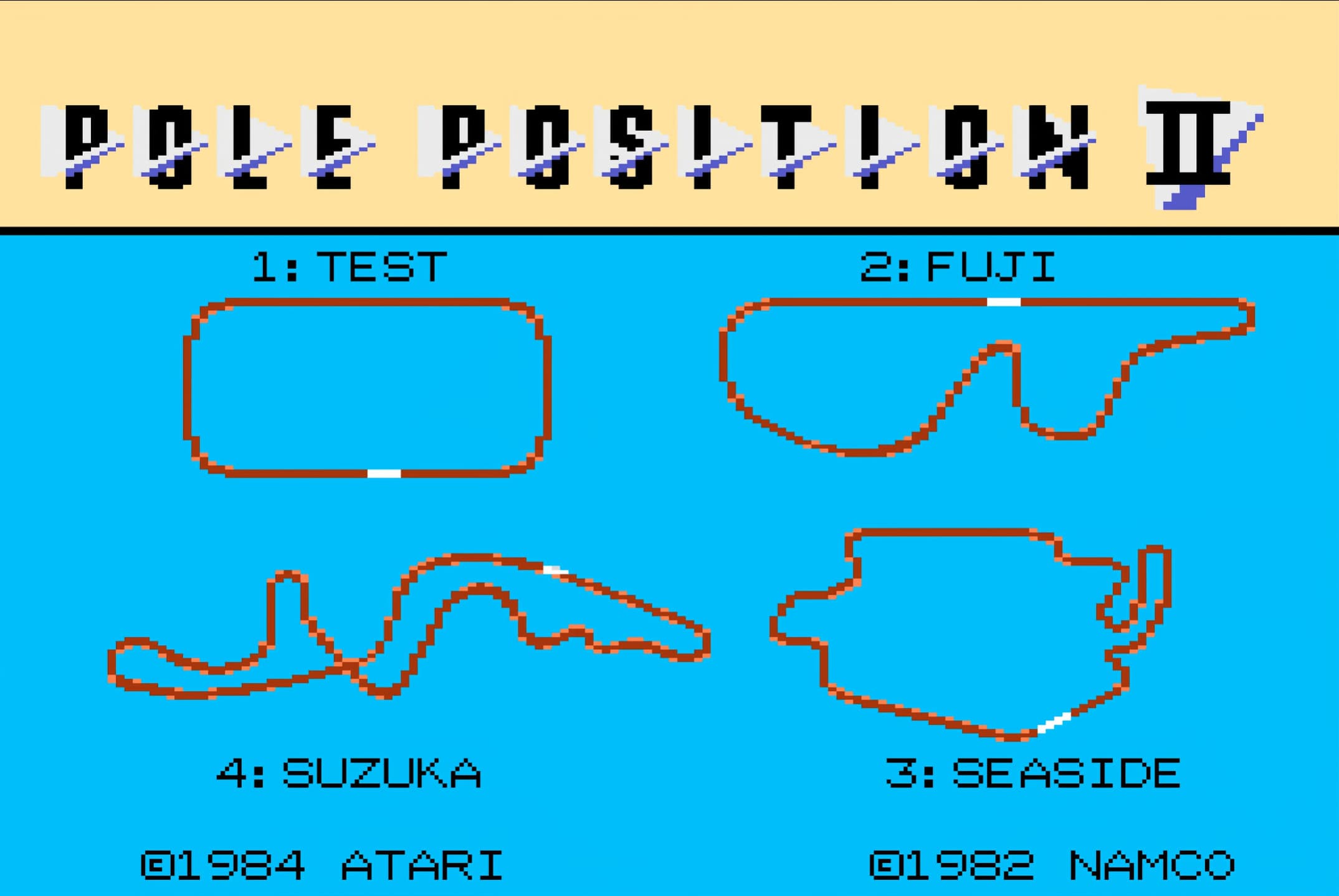 Pole Position II is an arcade racing game and the sequel to Pole Position. Players can choose from four tracks: Fuji Speedway, Test Track (modeled after Indianapolis Motor Speedway), Seaside (resembling the 1982 US Grand Prix West), and Suzuka Circuit. The game features improved graphics, including car explosions with debris, new billboards, and an updated opening theme song. The gameplay focuses on racing against time while avoiding other cars and obstacles. The game introduces slight differences in the timer display between the Japanese ("TIME") and American ("UNIT") versions.
