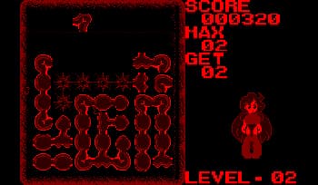 The game features 100 levels, each with a specific number of shapes to clear, while the final level is an endless loop. Players can adjust the gameâs speed from "Low" to "Mid" to "Hi" at the title screen, with "Mid" being the fastest. Although players receive a password upon completing each level, there is no screen to input these passwords, rendering them ineffective.