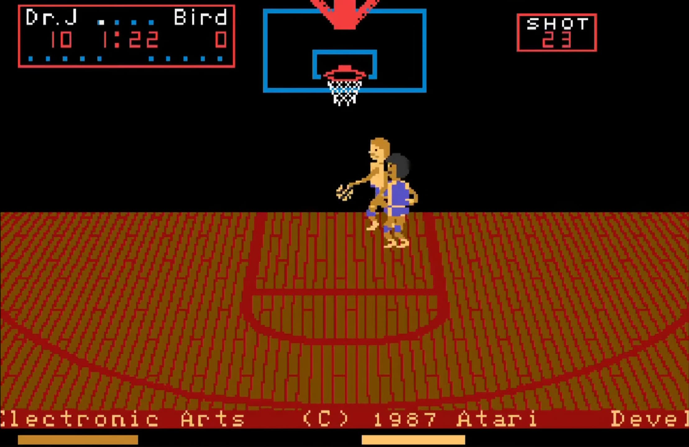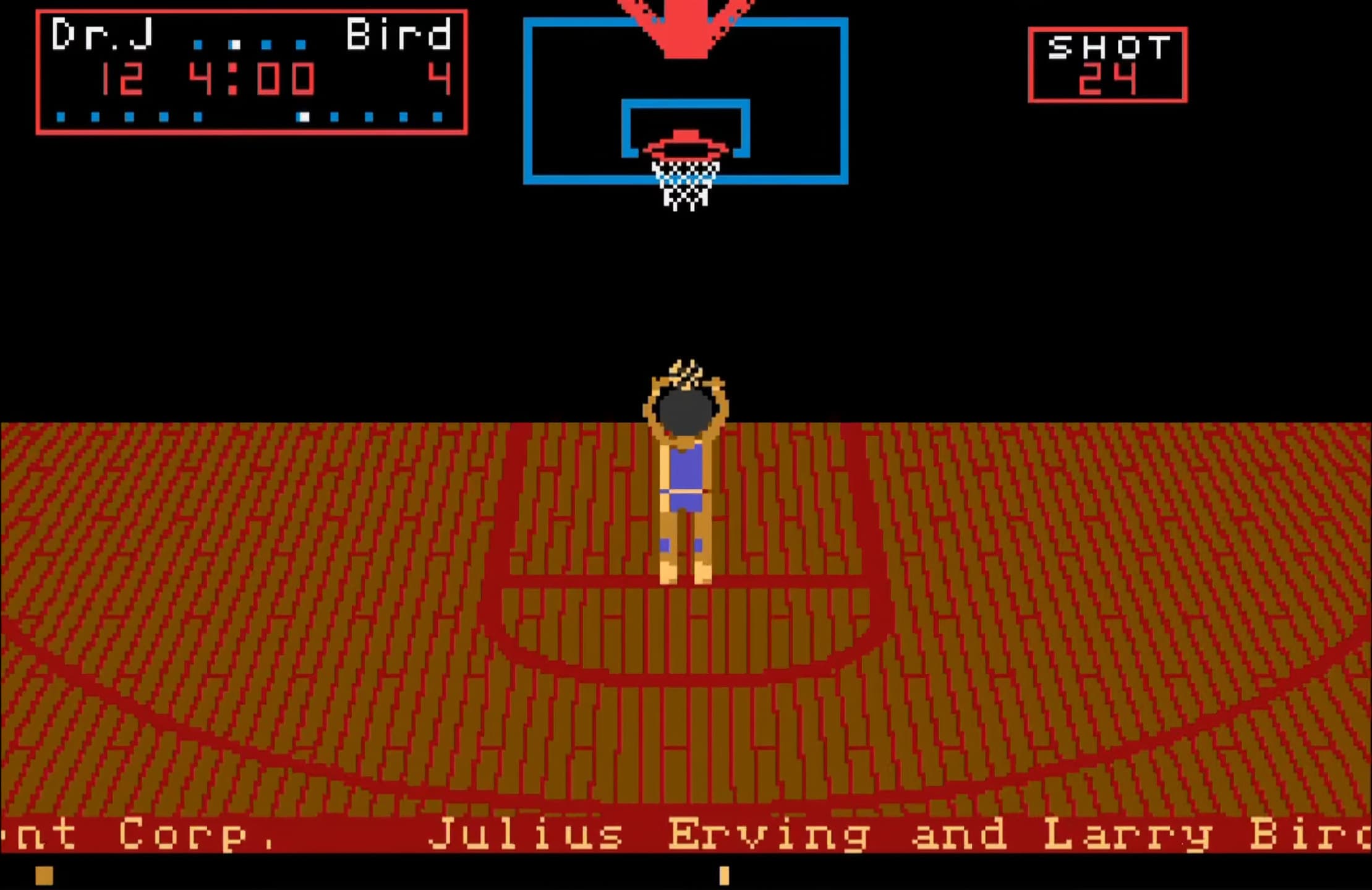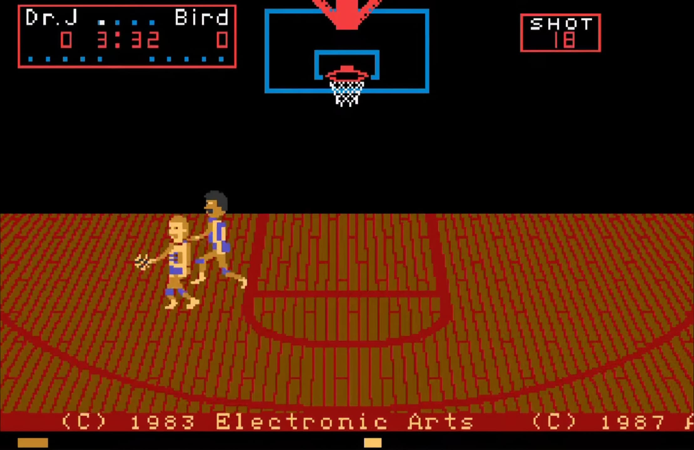 The game can be played either against another player or the computer, with options to play to a certain score or within a timed limit. A fun feature is the possibility of shattering the backboard with a dunk, triggering a janitor to sweep up the shards while delivering humorous, censored complaints. Overall, One on One Basketball offers a lighthearted yet competitive experience with its unique blend of basketball simulation and arcade-style fun.