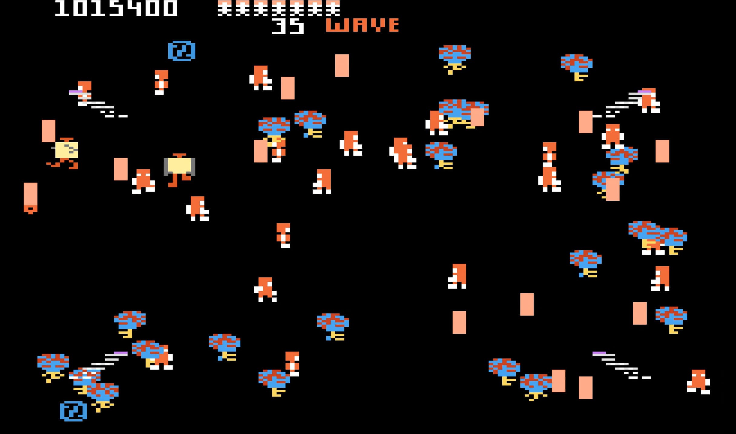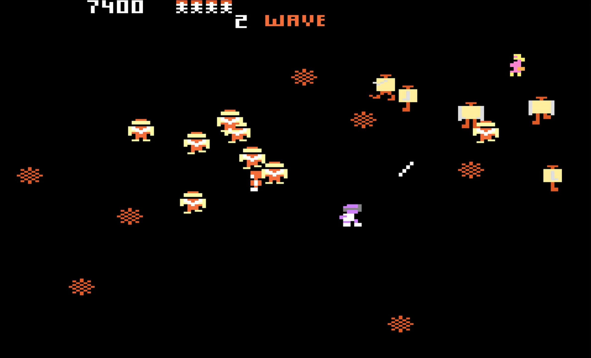 Human family members appear in each wave and can be rescued for bonus points, but they can also be killed or converted into enemies by certain robots. Players progress by destroying all vulnerable robots, rescuing family members, and surviving until the next wave begins. Extra lives are awarded at certain score thresholds, and the cycle continues until all lives are lost